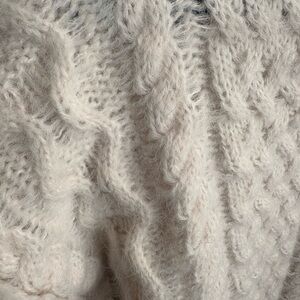 Elegant cream V-neck sweater with intricate cable knit design. Soft and comfortable for any occasion.