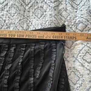 These head-turner black flared leg palazzo pants are crafted from sheer mesh and feature a high-rise fit, an elastic panel on the back of the waistband, textured ruffled detailing on the mid-section, and extreme flared tulle detailing that starts at the upper thighs and skims the floor. Complete with inner stretch shorts, and concealed size zipper closure. Sz 2X