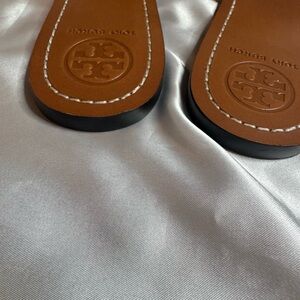 Elegant black slides with signature logo. Comfortable tan footbed. Ideal for versatile wear. Like new. Size 10