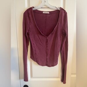 It is a fitted, ribbed, V-neck long-sleeve top known for its soft cotton blend fabrication and seam detailing.