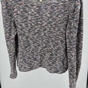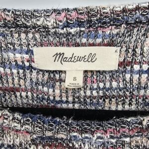 Cozy knit sweater by Madewell. Features a blend of colors including pink, gray, blue, and cream. Perfect for layering.