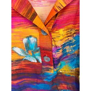 Keywords: abstract art, painterly, vibrant, button down, collared shirt, casual, lightweight, viscose rayon, plus size, artistic, bold print, unique