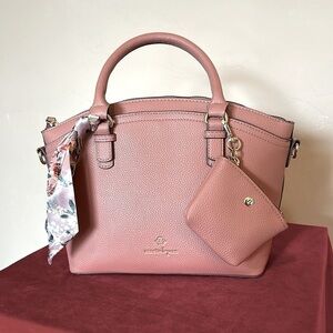 The Pilar satchel by Nanette Lepore is an IT-girl go-to with a dome shape made from pebbled faux leather that can worn crossbody or in hand. A printed scarf adds a pretty, trendy element. Plus included is a matching detachable zip coin pouch — color is a beautiful taupe-y old rose color