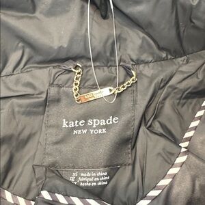 NWT Kate spade water resistant coat. Diamond shaped quilted zip up coat in black with gold hardware. Lightweight fill, removable drawstring hood, stand collar, elastic cuffs, front snap welt pockets. 100% polyester material. Comes with matching packing sack! Ladies size XL.