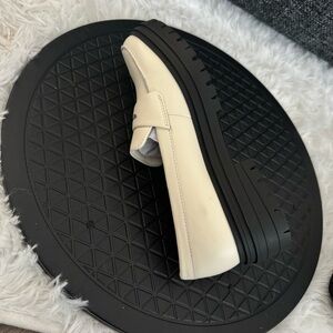 Chic cream loafers by Quince. Features sturdy black soles. Ideal for versatile wear.