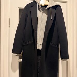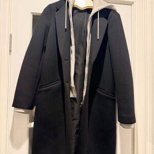 Contrasting coat with removable hood and long sleeves. Front welt pockets. Front metal zip and button closure.