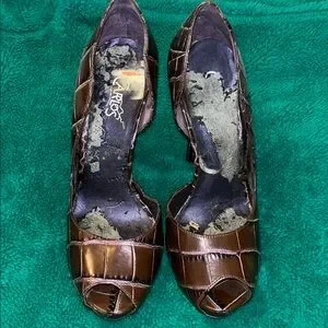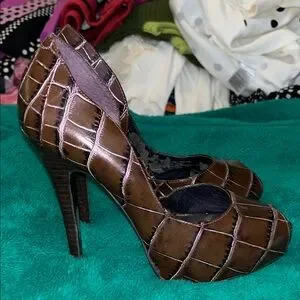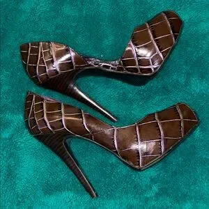 Chic brown heels with croc-embossed pattern. Stylish peep-toe design by Carlos Santana.