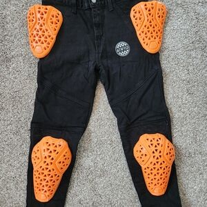 This pair of ATWYLD women's Voyager Moto Jeans are in excellent condition. I purchased them in 2021 and wore them maybe 2 or 3 times. They come with the knee and hip protectors that zip in easily, along with the sticker that came with. Please see the last two pics for the specifics on the protective tech. The jeans themselves are pretty comfortable from what I can remember, although I don't think I wore them with the pads at all. I must have cut off the tag at the back of the waist, because that is missing, but I do have the bag the jeans came in, which lists the size.