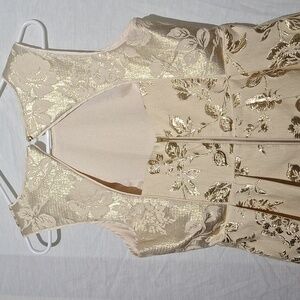 NEVER WORN! Mini Party dress with gold metallic floral Rose design. Sleeveless and stylish. Lined in a cream shade with open upper back. Dry clean.