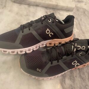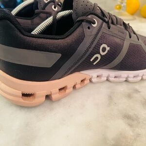 Sleek On Running shoes in black with pink accents. Ideal for running and casual wear. Wonderful shoe, retail $160, one shoe has minor damage due to a hot flat iron packed in my weekender bag and slightly melted the edge, not impacting the integrity of shoe. My loss your win! Check out pics the shoe is flawless, otherwise!
