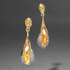 Radiant molten 14k gold plated metalwork oozes over dazzling pavé crystals on this striking teardrop earring, that play with light and texture from the sculptural silhouette. Sold as a pair.