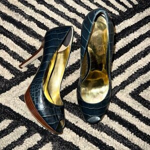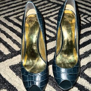 Sophisticated dark blue heels with croc-embossed texture. Peep-toe design. Perfect for elegant occasions.