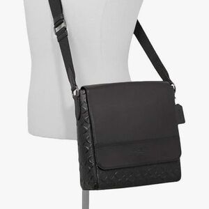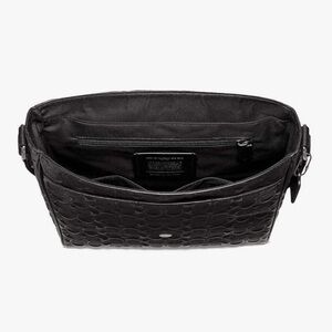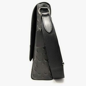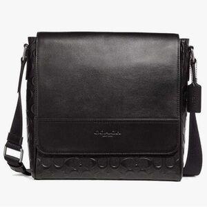 Coach Houston Map Bag. Signature refined calf leather. Fabric lining. Adjustable strap with 25" drop. Inside zip pocket. Magnetic snap closure.