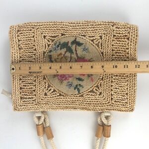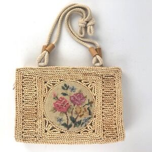 Vintage Straw Floral Needlepoint Medium Handbag Accent Summer Lined Zip Cottage