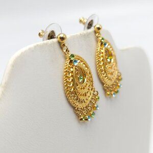 Joan Rivers Gold Tone Filigree Drop Earrings W/ Green & Blue Rhinestones