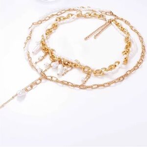 Enhance your style with this elegant layered necklace featuring gold chains and delicate pearls. Perfect for any occasion.