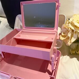 Stylish pink and white make up and storage box with a speckled design. Features a convenient handle for easy carrying.