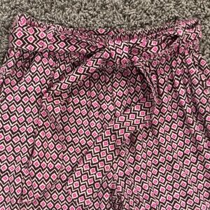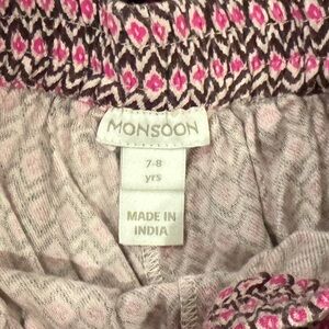 Girls Monsoon pull on jogger pants with pink, brown, and tan geometric design. Has elastic at the ankles, elastic at the waist with a tie. Size 7-8. In excellent condition.