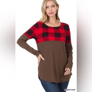 Chic long sleeve top with bold red and black plaid. Brown lower section adds contrast. Ideal for casual wear.
