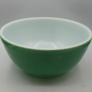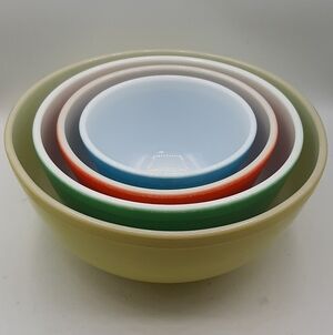 Discover a vibrant addition to your kitchen with this set of four PYREX Primary Colors Nesting Mixing Bowls. Each bowl, sized 401, 402, 403, and 404, boasts a glossy finish and a solid pattern in lively, mid-century modern hues. Crafted from durable milk glass, these bowls are a stackable solution for all your mixing needs, whether you're whisking up a batch of cookies or tossing a salad. With a backstamp impressed from the 1970s, this original, four-piece set brings a touch of nostalgia to any occasion. Though they're not for antique lovers, these bowls are a testament to America's rich milk glass tradition. For longevity, hand washing is recommended, but their timeless style ensures they'll look perfect on your countertop no matter the use.
