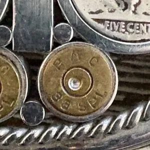 The design also features four spent brass bullet casings or caps as decorative elements.