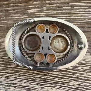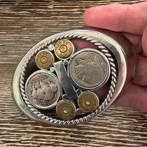 Vintage custom belt buckle featuring Buffalo nickels and brass bullet casings