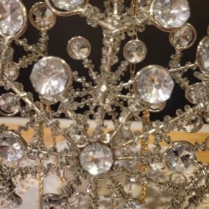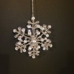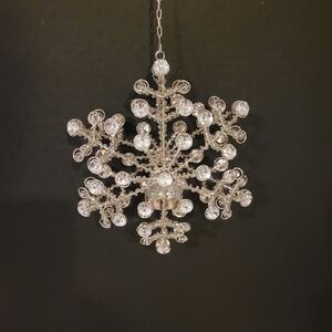 An eye-catching hanging Candle holder Snowflake design with many Shiny bedazzled crystal-like pieces.