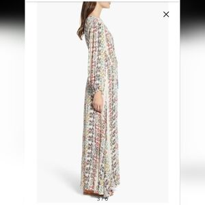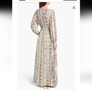 Vibrant, floral scrolls add to the cheery air of a softly crinkled maxi dress drawn in at the waist by tassel-tipped ties.