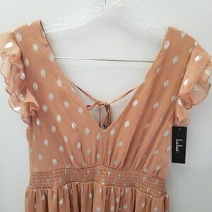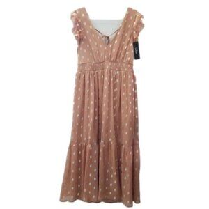 Lulus Exclusive! When you've got the Lulus Cause to Celebrate Mauve and Silver Ruffled Tiered Midi Dress, there's always a reason to celebrate! Crinkly woven chiffon, with metallic silver dots throughout, shapes a V-neckline and back (with a tying detail), and a sleeveless bodice with a ruffled trim. Stretchy smocked waistband tops a flowy midi skirt with a tiered drop seam.