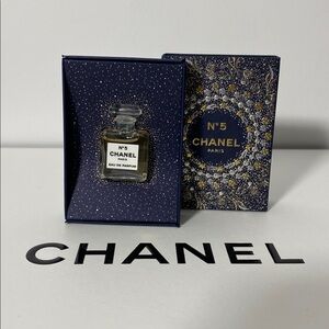 Stunning CHANEL N°5 box. Features gold and white accents on a deep blue background.