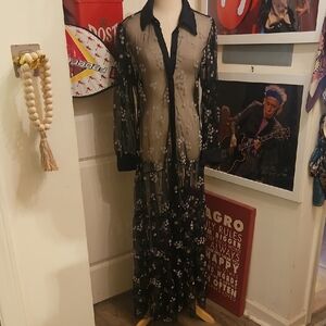Chic Black Floral Embroidered Long Sleeve Sheer Maxi Dress