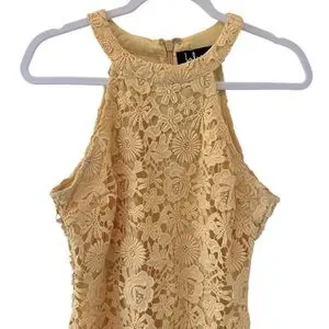 A lively pattern of non-stretch crochet floral lace creates an eye-catching overlay atop knit fabric lining. Halter neckline and darted sleeveless bodice transition into a chic, sheath skirt with a mini. Hidden back zipper with clasp.