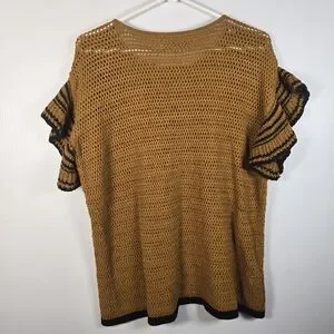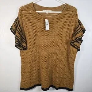 NWT Loft Women's Mustard Crochet Top with Black Trim Size L Ruffled Sleeve