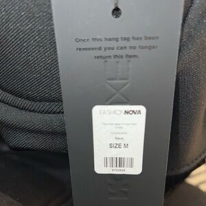Sleek black dress with a daring backless design. Features elegant fringe accents. Ideal for evening wear.