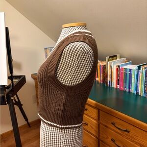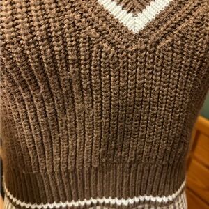 Chic brown knit vest with white accents. Ideal for layering. Slight pilling as shown in pictures.