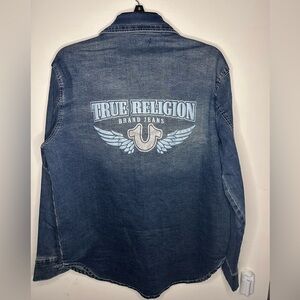 Classic blue denim shacket with button-up front. Features chest pockets and signature stitching as well as a beautiful glittery design on the back. This piece is gorgeous and is the high quality that you can expect from True Religion brand!!
