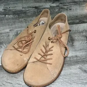 Stylish brown suede flats with lace-up design. Ideal for casual wear. Comfortable and versatile.