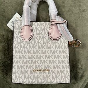 Chic Michael Kors mini bag with a stylish pink and cream design. Perfect for adding elegance to any outfit. Features signature logo charm.