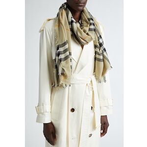 The instantly recognizable checks rendered in a blown-out scale lend archival flair to a sumptuous wool scarf trimmed with delicate eyelash fringe. Absolutely stunning!