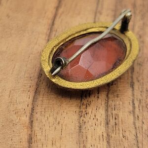 This is a very old brooch from Victorian era. Featuring a genuine oval cute & faceted citrine stone set in a low karat gold plated brass hardware with c-clasp closing mechanism.