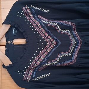 In great condition. Very minimal wear. High neck with small ruffle. keyhole closure in back. Beautiful colorful embroidery on yoke. long sleeve, loose flowy fit. flat measurements pit to pit 29in, length 29in, sleeve 24.5in