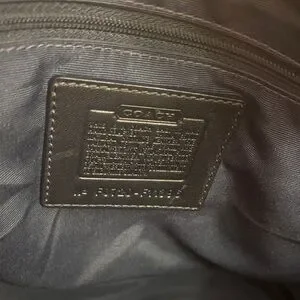 Elegant Coach tote bag in navy blue. Features sturdy handles and signature branding. Ideal for everyday use.