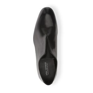 John Varvatos' Leather Eldridge Laceless Slip-On shoe is a handsome premium leather slip-on that boasts a one-piece silhouette to the upper with a split tongue silhouette that reveals an inner tongue inside. It's a cool walk into inky layers and a nicely molded silhouette that one can dress up or down.