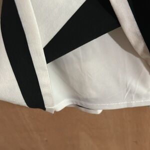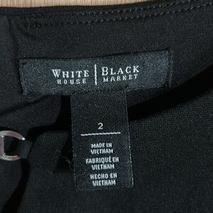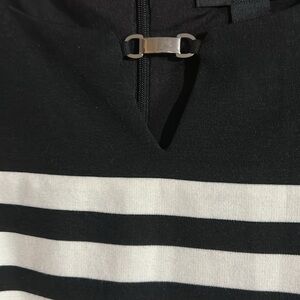 This sophisticated sheath midi dress from White House Black Market features a classic black and white color scheme. Designed with a crew neck and short sleeves, it offers a chic and polished look suitable for work or cocktail occasions. The fitted silhouette and monochromatic stripes create a timeless appeal, making it a versatile addition to any wardrobe.