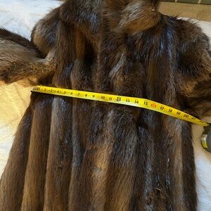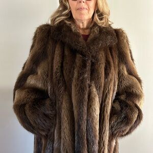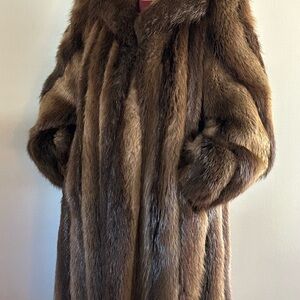 A stunning full-length Beaver~Fox Fur coat. Beaver fur, combined with fox fur elements for added softness and flair. The Beaver fur is known for its warmth and durability.