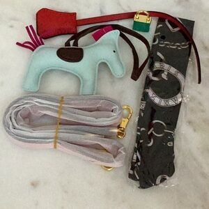 Stylish red leather women's bag with a playful charm. Perfect for adding a pop of color to any outfit.Gold Tone Hardware.Removable crossbody strap.Flap closure with twist lock.Interior has zip and slip pocket.4 bottom protective feet.Comes with pony,lock and key and scarf.