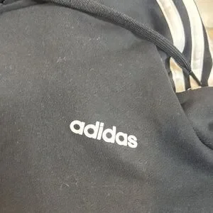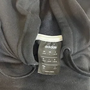Classic black hooded sweatshirt with white accents. Features Adidas logo. Ideal for casual wear.