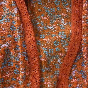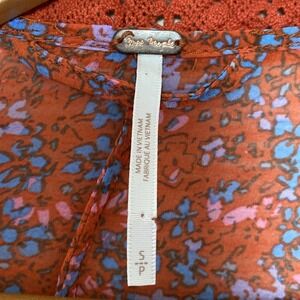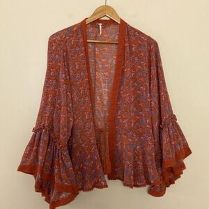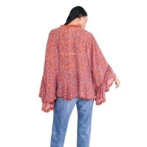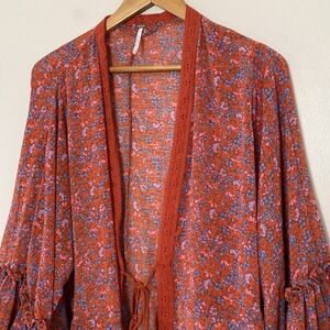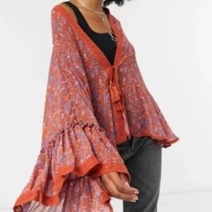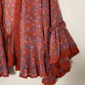 Free People Lola Kimono in Wild Red Ditsy Floral Tassel Tie Front Bell Sleeves S