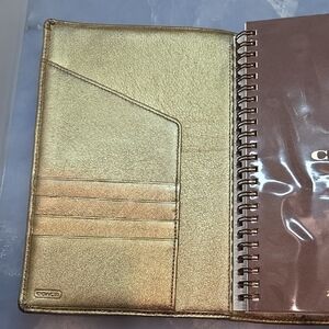 Coach Signature Collection day planner cover with monogram pattern and gold leather trim. Features a gold button closure clasp, interior pockets and ID card holders. Item comes with blank notepad and original gold pen. The notepad was used lightly and is only missing 2-3 pages.