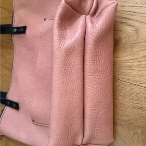 This stylish tannish pink/coral Portland Leather tote bag is perfect for any occasion. Its sleek design and durable material make it a must-have accessory. Zipper top.